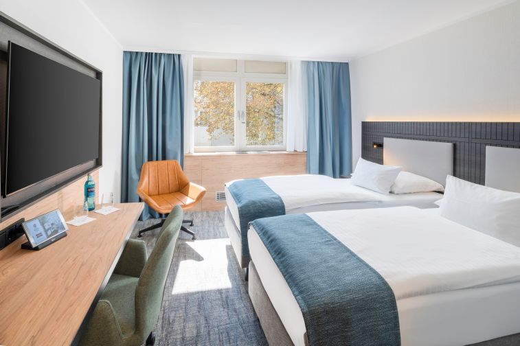 Standard Zimmer, Klimaanlage, Schreibtisch, Minikühlschrank, kostenfreies WLAN, Flatscreen TV, auf Wunsch auch mit zwei Einzelbetten
