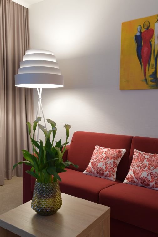 Deluxe Zimmer, Schreibtisch, Kühlschrank, TV, Laptopsafe, kostenfreies WLAN, Klimaanlage, ebenerdige Dusche und Badewanne, auf Anfrage behindertengerechtes Bad, Kitchenette, Sofa