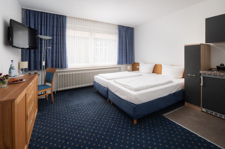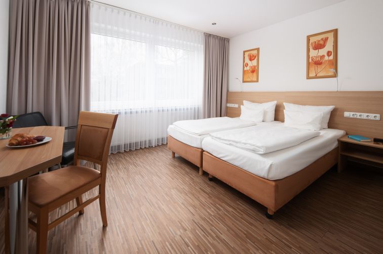 Standard Zimmer, auf Wunsch mit zwei Einzelbetten, kostenfreies W-Lan, Zubereitungsmöglichkeiten für Kaffee und Tee